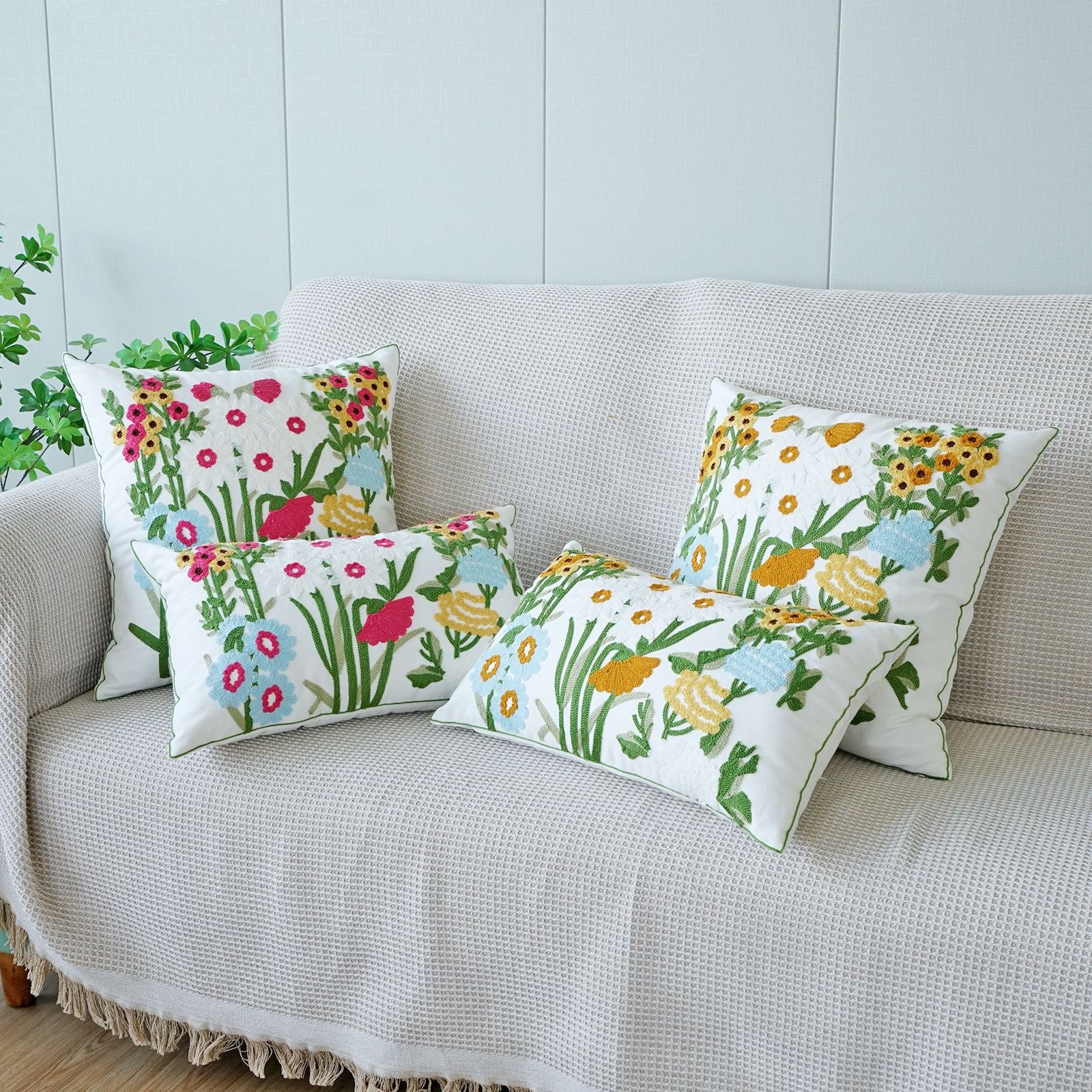 Rustic 3D Floral Embroidered Pillow Set | 2×45×45cm Squares + 2×30×50cm Rectangles | Nature - Inspired Sofa Cushions for Living Room